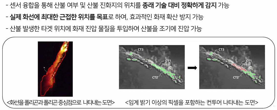 - 기술개요인공지능을 이용해 타겟 위치를 결정하고, 복수의 센서로부터 획득된 영상에 기초하여 화재 진압 여부 결정