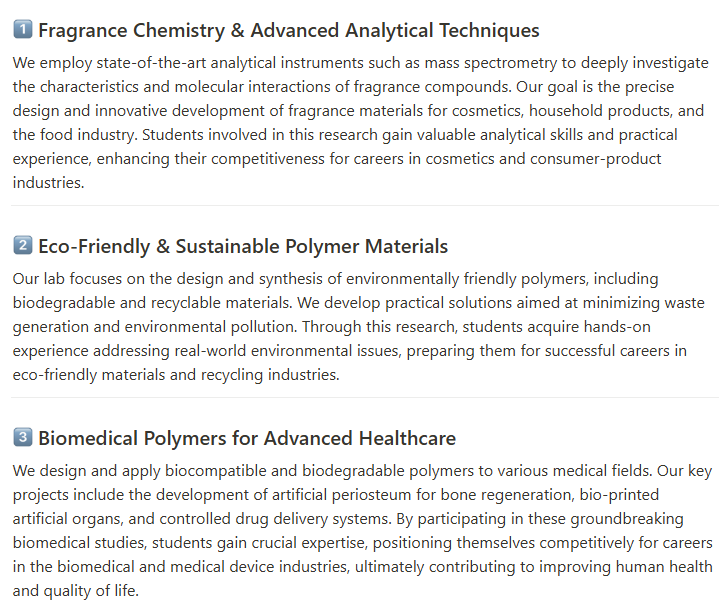 - 기술개요Fragrance Chemistry & Advanced Analytical Techniques, Eco-Friendly & Sustainable Polymer Materials, Biomedical Polymers for Advanced Healthcare