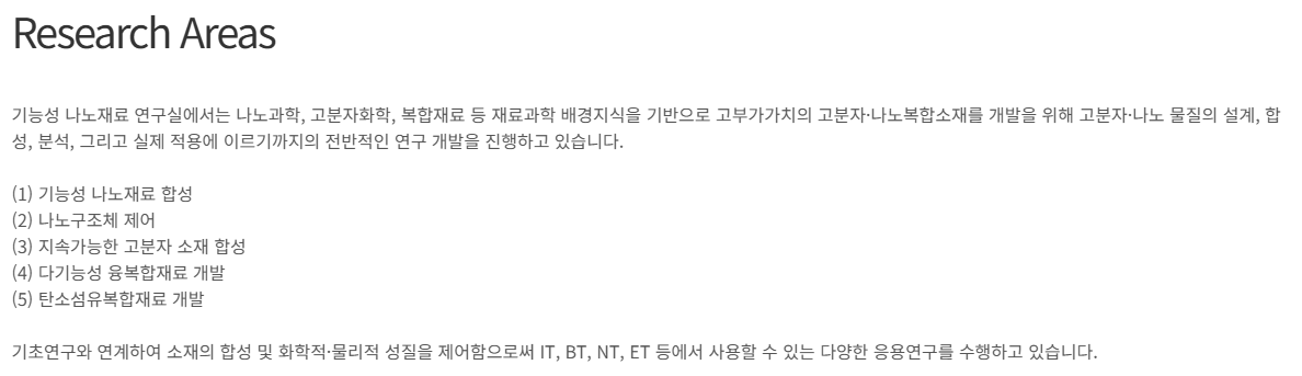 - 적용분야#기능성 나노재료 합성, #나노구조체 제어, #지속가능한 고분자 소재 합성, #다기능성 융복합재료 개발, #탄소섬유복합재료 개발