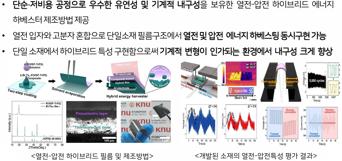 - 기술개요단순∙저비용 공정으로 우수한 유연성 및 기계적 내구성을 보유한 열전-압전 하이브리드 에너지 하베스터 제조방법 제공