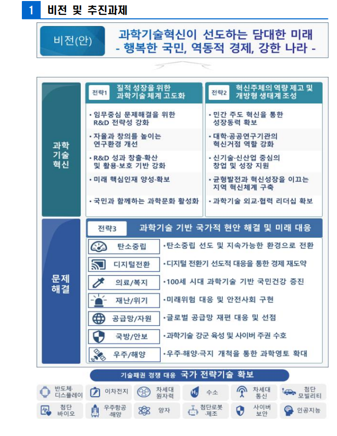 1. 임무중심 R&D: 국가적 도전과제 해결을 위한 임무중심 R&D 체계 도입, 기술주권 확보를 위한 전략기술 발굴/육성, 고위험/도전 연구 활성화